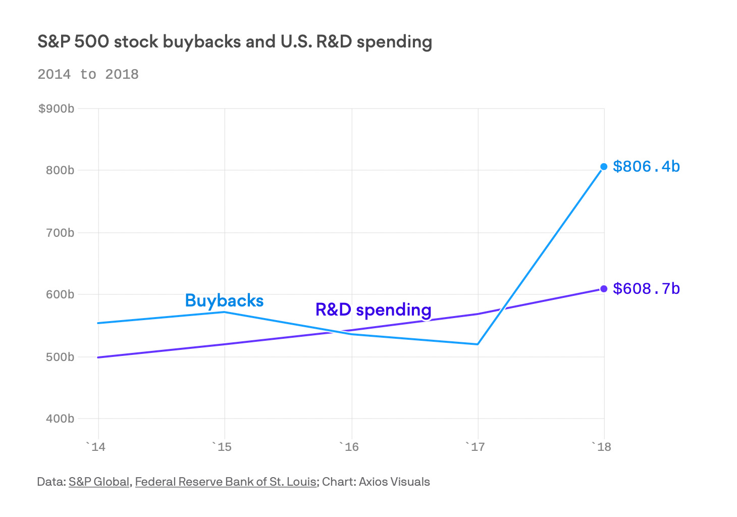Part of the problem is that the buyback splurge often exceeded what was spent on actual, productive research and development, as shown below.